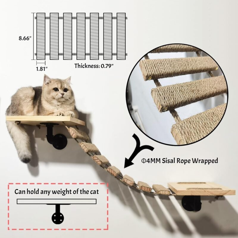 【Fashion Design】: Designed for mounting on the wall, it saves space in your home and satisfies cats’ natural instinct for heights; Moreover, the natural pine wood complements any home decor along with the sisal ladder